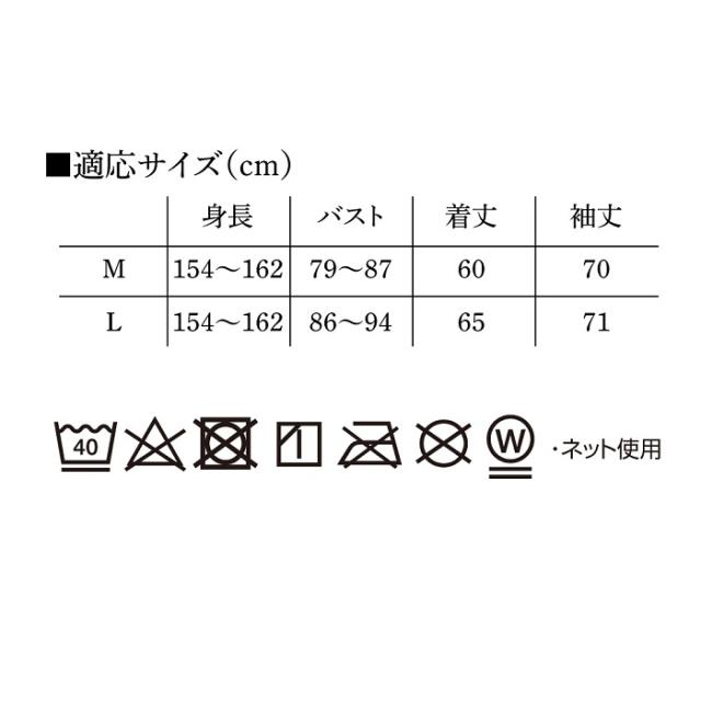 ●適応サイズ/重量(約):Mサイズ:身長154〜162cm、バスト79〜87cm、着丈60cm、袖丈70cm/300g