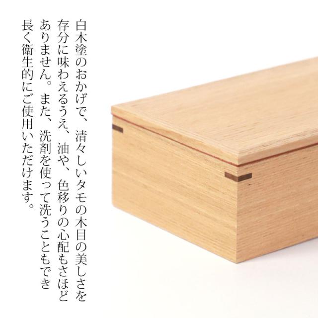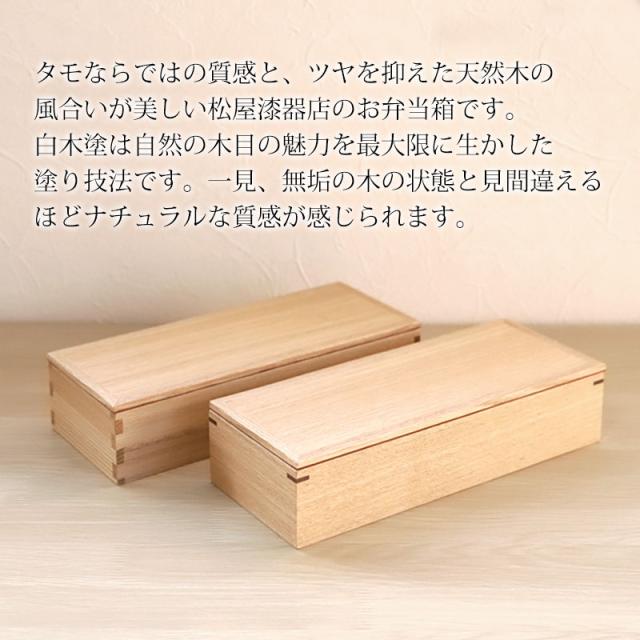 タモならではの質感と、ツヤを抑えた天然木の風合いが美しい松屋漆器店のお弁当箱です。