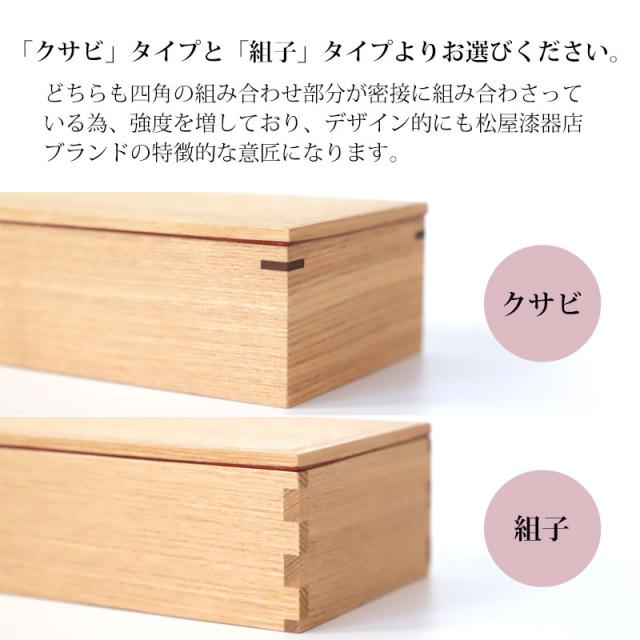 「クサビ」タイプと「組子」タイプよりお選びください。どちらも四角の組み合わせ部分が密接に組み合わさっている為、強度を増しており、デザイン的にも松屋漆器店ブランドの特徴的な意匠になります。