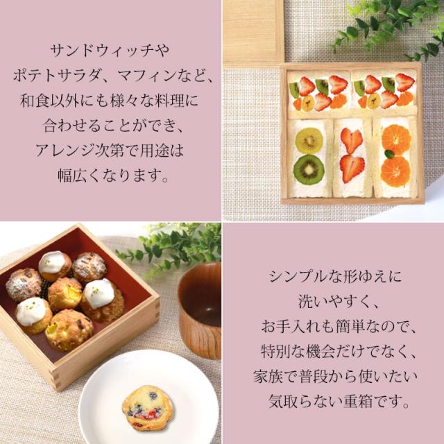 | 商品説明 | タモならではの質感と、ツヤを抑えた天然の白木の風合いが美しい松屋漆器店の重箱です。 内側、外側ともに白木塗でシンプルで統一感のある「ナチュラル」と、内側が朱色塗りで料理が映える「内朱」の2タイプがございます。 松屋漆器店の重箱の特徴は、四角の組み合わせ部分が組み子のように密接に組み合わさっている為、強度を増しており、デザイン的にもチャームポイントになっています。 また、蓋の縁取りや側面の板をつなぐ組子仕上げは、自然素材ならではの美しさをより良く引き立ています。 白木の軽やかさを持ち、サンドウィッチやポテトサラダ、マフィンなど、和食以外にも様々な料理に合わせることができ、アレンジ次第で用途は幅広くなりますね。 白木塗は自然の木目の魅力を最大限に生かした塗り技法であり、ウレタン塗装でありながら艶を抑えた仕上がりになっております。 一見、無垢の木の状態と見間違えるほどナチュラルな質感が感じられます。 白木塗のおかげで、清々しいタモの木目の美しさを存分に味わえるうえ、油や、色移りの心配も差ほどありません。 また、洗剤を使って洗うこともでき長く衛生的にご使用いただけます。 お正月にはお節を入れて、お花見に、運動会に、その他行楽行事にも。 重箱は一年中活躍してくれます。 年に1、2回しか出番が無いと思うと、なかなか手を伸ばしにくい重箱。 実は、そのシンプルな形ゆえに洗いやすく、お手入れも簡単なので、特別な機会だけでなく、家族で普段から使いたい気取らない重箱です。 松屋漆器店とは 松屋漆器店は、福井県鯖江市河和田町にある、越前漆器の製造元です。 創業は1905年と古く、1500年以上の歴史を持つ越前漆器の産地で、伝統技術を継承しつつ、現代のライフスタイルに合わせた商品開発を進めています。 松屋漆器店の特徴は、白木塗を用いたナチュラルな風合いの漆器を主力商品としていることです。 伝統的な技術を生かし、高品質な漆器を提供することにこだわっています。 また、製品のデザインや使い勝手にもこだわりを持ち、お客様に満足していただける漆器を提供しています。 松屋漆器店は、越前漆器の魅力を世界に発信するため、国内外の展示会にも積極的に参加し、伝統的な越前漆器の技術を守りつつ、新しい価値を創造し、世界中に愛される漆器を生み出すことを目指しています。 専用の仕切りもございますので、ご希望に合わせて別途お買い求めください。 仕切りがあると、料理ごとにわけて詰めやすく、見た目も一段とおしゃれに見えます。 |