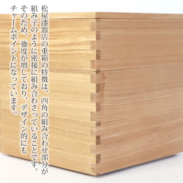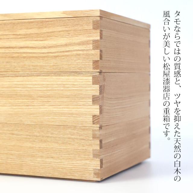 タモならではの質感と、ツヤを抑えた天然の白木の風合いが美しい松屋漆器店の重箱です。