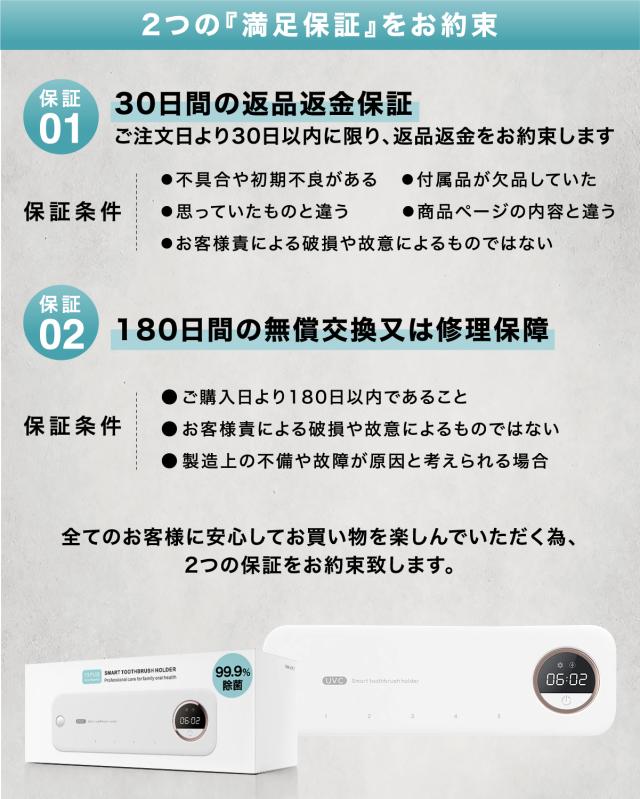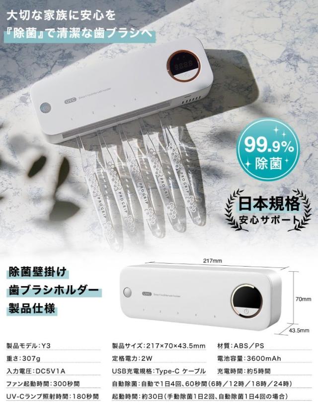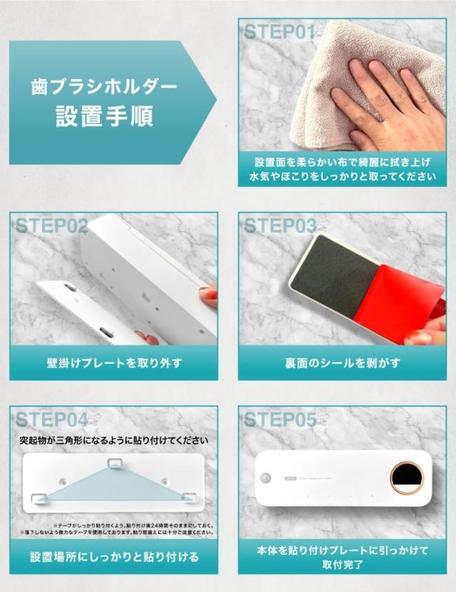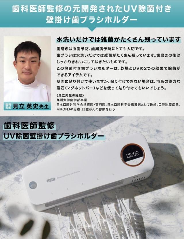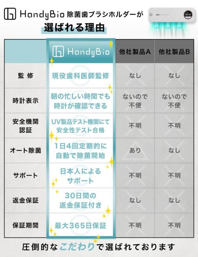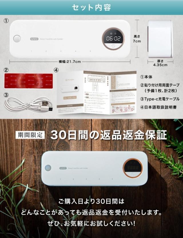 | 商品の説明 | 【深紫外線UV-C LEDライトで強力除菌!!】 歯ブラシ後の雑菌に効果的な254nmの波長で菌を細胞から破壊!いつでも清潔な歯ブラシでブラッシングをサポート。 【現役歯科医師監修】 現役歯科医師監修の元、開発された除菌歯ブラシホルダー。 歯ブラシの雑菌をUVCライトとファンで乾燥させ、効果的に除菌いたします。 【安心安全なUVC製品】 Handybioの歯ブラシ除菌器は第3者機関にて世界規格の認証試験を行い、安全性が認められた製品です。 類似品の中には健康に悪影響を与える製品もございます。 安全性試験を合格しておりますので、ご安心してHandyBioの製品をお買い求めくださいませ。 【強力両面テープで簡単取り付け】 壁に穴を空ける必要もなく、両面テープで設置が出来るので賃貸などでもご使用いただけます。歯ブラシをスタイリッシュに収納できる点も人気の秘密です。 ※本製品の両面テープは落ちないよう強力な両面テープとなります。接地面にマスキングテープ等お貼りいただくことで取り外しが簡単になります。 【便利な時計機能付き】 忙しい朝にとっても役立つ便利な時計機能付き!時計機能が無い製品と比べると利便性も大きく変わってきます。 ※人がいない時は節電の為消灯しております。 【除菌と乾燥でWの安心】 除菌3分+乾燥5分で歯ブラシ後の雑菌を徹底除菌! 除菌中は残秒がデジタルで表示され、実用的でわかりやすい表示です。 【1日4回の定期除菌】 6時、12時、18時、24時の計4回自動で歯ブラシを除菌いたします。歯磨き前に定期的に自動で除菌されるのでいつでも清潔な歯ブラシをお使いいただけます。 |