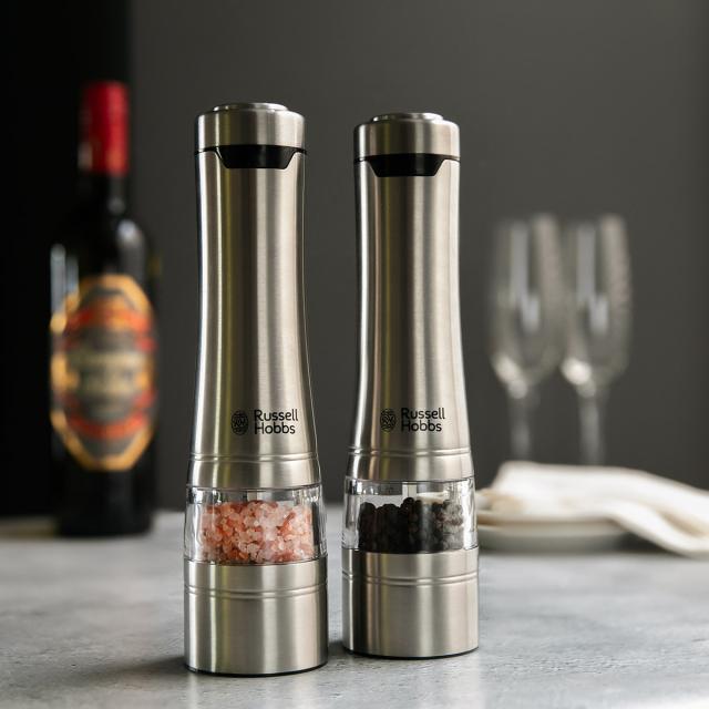 Russell Hobbs 電動ミル 2本セット ソルト&ペッパーミル ( ラッセルホブス ミル 2個 LEDライト付き 電池式 ボタン式 ソルトミル ペッパーミル ワンプッシュ セラミック刃 スタンド付き 胡椒 岩塩 香辛料 )