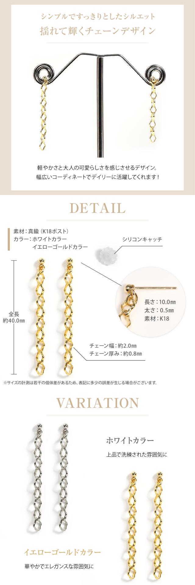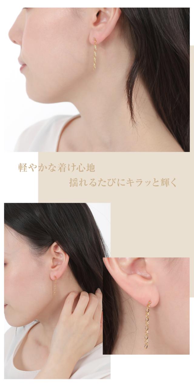 「 ホワイトカラー 」と「 イエローゴールドカラー 」の2カラーから選べる チェーンピアス 。程よい艶感のある ロングピアス は、デイリー使いにもおすすめです。シンプルなデザインで、どんなスタイルにも◎ポスト部分は、金属アレルギー対応の「 K18 ( 18金素材 ) 」を使用してるので、お肌に優しく安心です。