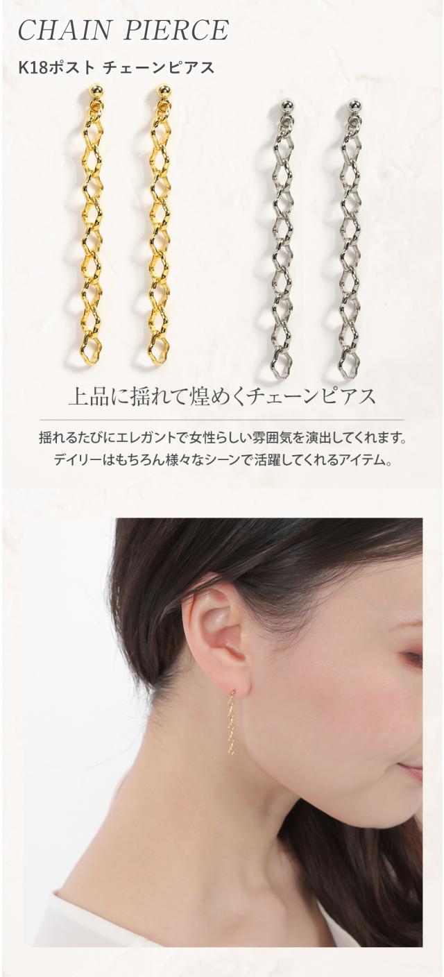 ジュエリー感のある洗練された質感と安心の「 K18ポスト 」「 ホワイトカラー 」と「 イエローゴールドカラー 」の2カラーから選べる チェーンピアス 。程よい艶感のある ロングピアス は、デイリー使いにもおすすめです。シンプルなデザインで、どんなスタイルにも◎ポスト部分は、金属アレルギー対応の「 K18 ( 18金素材 ) 」を使用してるので、お肌に優しく安心です。