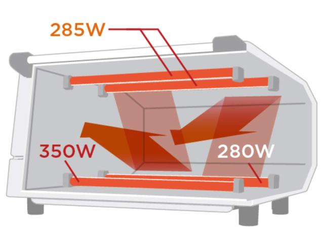 熱は上にのぼる性質があるため上の570Wに比べて下を630Wと出力を大きくし、手前はドアから熱が逃げやすいため350Wの一番大きな出力に。あわせて、庫内奥の形状を斜めにすることで熱が中央に向かって反射され、庫内の温度を均一にしてパン両面をしっかり焼き上げます。