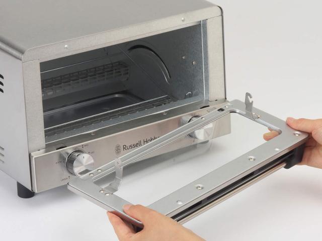 扉が外せるのでトースター内の奥まで掃除がしやすいです。付属のワイヤーラックと受皿だけでなく、パンくずトレイも手前に引き出すだけで外せて簡単に洗えます。