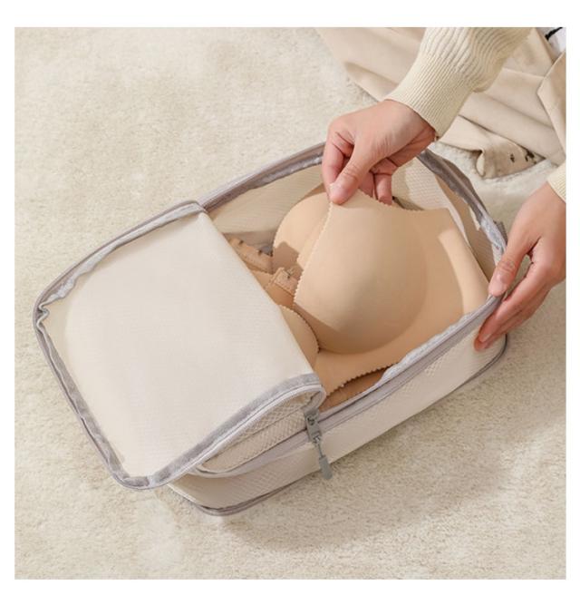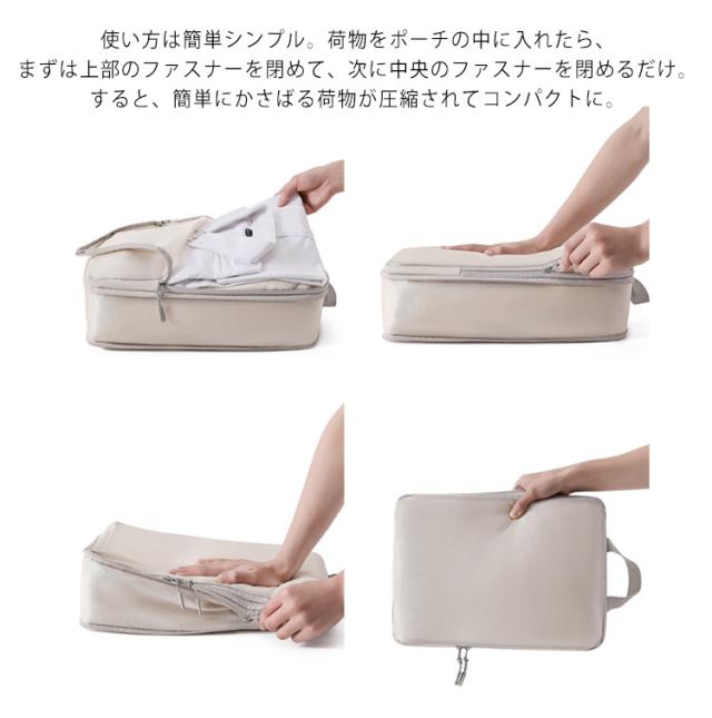 | 4点セット!ファスナーを閉めるだけで洋服の厚みがコンパクトになる圧縮できるトラベルポーチ。 S、M、L、XLサイズの4個セットなので便利。中に入れる量や内容に合わせて、サイズを使い分けることが出来ます。 使い方は簡単シンプル。荷物をポーチの中に入れたら、まずは上部のファスナーを閉めて、次に中央のファスナーを閉めるだけ。すると、簡単にかさばる荷物が圧縮されてコンパクトに。 空気を抜く手間もないので、旅行の荷造りもスムーズになります。 防水・撥水生地でできているため、水着や濡れた衣類を収納するのにも安心。 旅行や帰省、出張など、色んなシーンで活躍してくれています。 | |