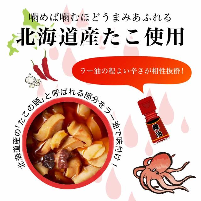 | 商品説明 | 北海道産の「たこの頭」の部分を、ラー油で味付けしました。 噛むほどに旨味が溢れ出てくるタコと、ラー油の程よい辛さが相性抜群の逸品です。 そのままご飯のおかずとしても、お酒の肴にも最適です。 |