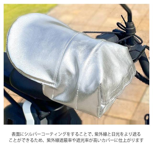 | バイク運転時の紫外線対策&雨対策に。 表面にシルバーコーティングをすることで、紫外線と日光をより遮ることができるため、紫外線遮蔽率や遮光率が高いカバーに仕上がります。 撥水・防水生地使用なので、突然の雨でも安心してお使いいただけます。 紐が付いているため、バイクハンドルやブレーキを側面の穴に通して紐を結ぶだけで簡単にハンドルに取り付けできます。 風通しが良い穴付きです。 バイクから原付、スクーター、オートバイまで幅広く対応します。 | |