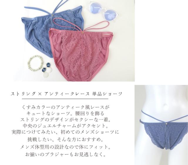 くすみカラーのアンティーク風レースがキュートなショーツ。腰回りを飾るストリングのデザインがセクシーな一着。中央のジュエルチャームがアクセント。実際につけてみたい、初めてのメンズショーツに挑戦したい、そんな方におすすめ。メンズ体型用の設計なので体にフィット。お揃いのブラジャーもお見逃しなく。