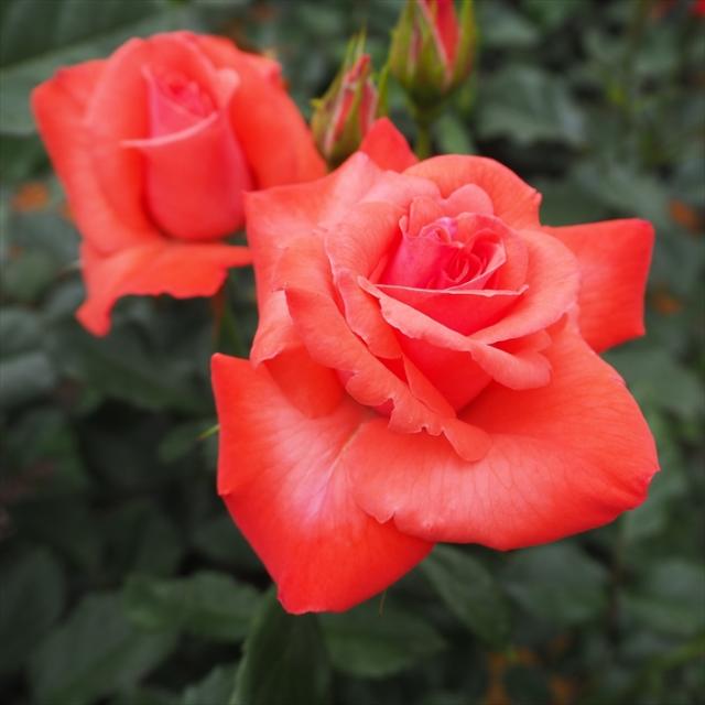 サーモンピンクのがかった朱色の半剣弁高芯咲きが素敵なバラ。