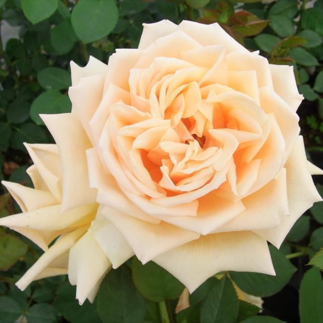 アプリコットイエローからペールオレンジの柔らかな色調の半剣弁高芯咲き。ハッキリとした香りを有していながらも花持ちが比較的良い方で、白っぽく花色が褪せながら、緩いロゼット咲きに変化する。