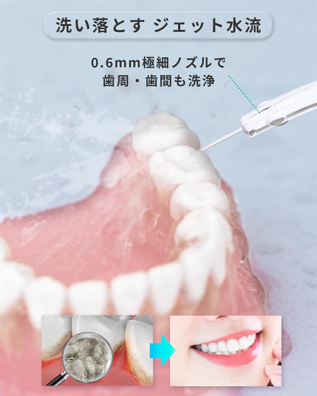 脈動数1800回/分のジェット水流と0.6mm極細ノズルで、最大100PSI(700kPa)のパワフルな洗浄能力を実現。