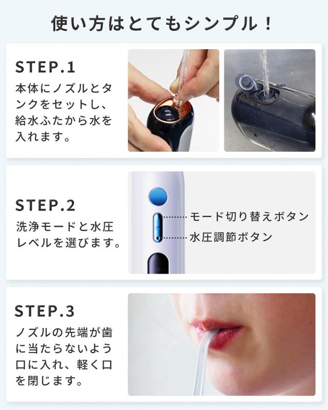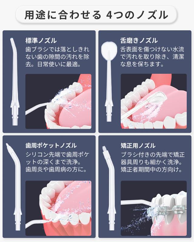 通常のノズルに加え、舌磨き用ノズルや歯周ポケットを狙い撃つノズル、矯正中でも使えるノズルなど、ひとつのパッケージで全ての口腔ケアに応えます。