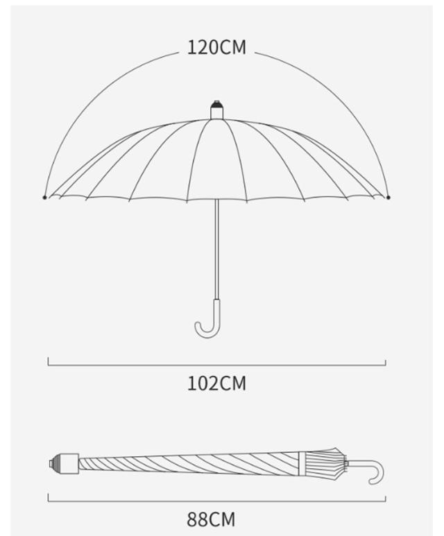 | サイズについての説明 | 全長:約88cm 直径:約102cm 親骨の長さ:約60cm 中骨:16本 |