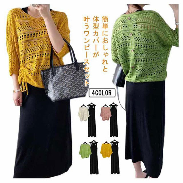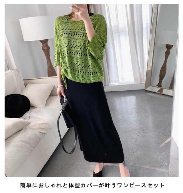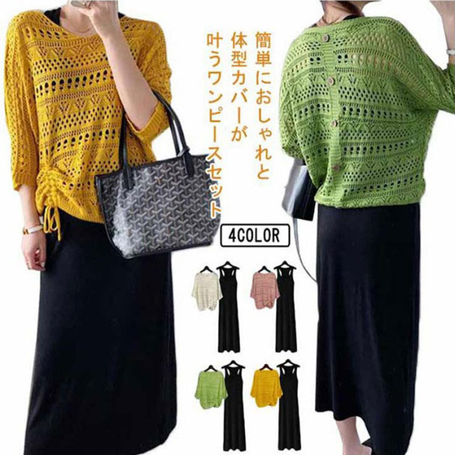 | 簡単におしゃれと体型カバーが叶うワンピースセット スタイルアップ見えするワンピース×メッシュニットのセットワンピースです。 この2点セットがあれば気になる二の腕やバストを自然に隠せる! 透かし編みの抜け感で爽やか!テクいらずでワンランク上のコーデが完成♪サイドギャザーがポイント。 合わせるだけでコーディネートが完成するのはもちろん、それぞれ単品でも着回せてデイリーに活躍します。 | |