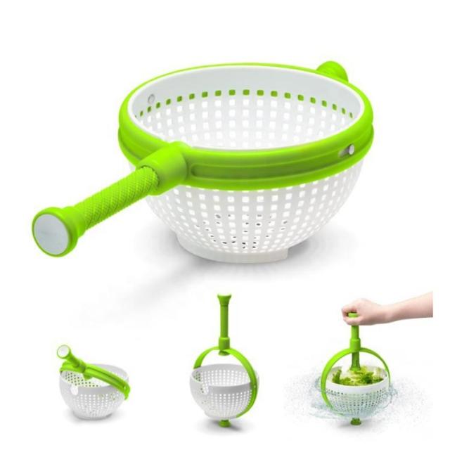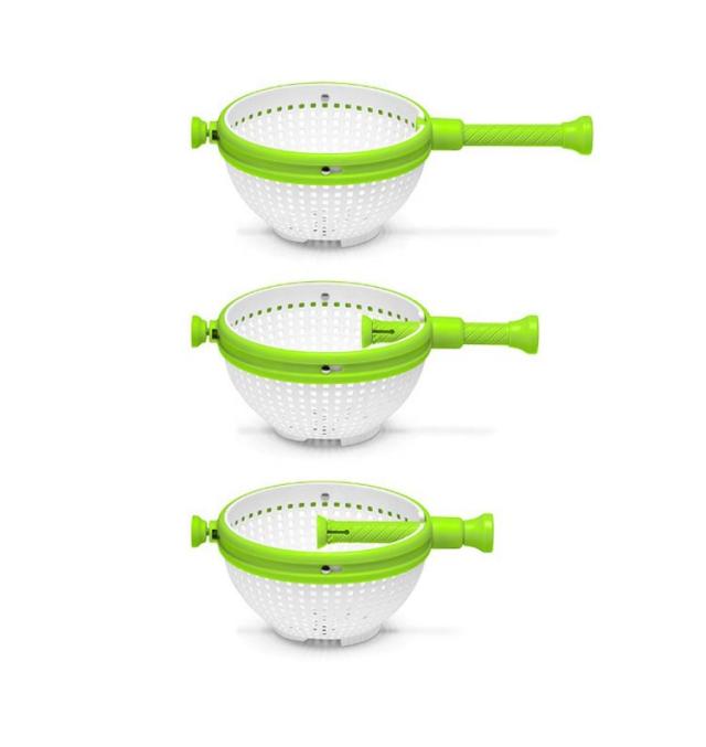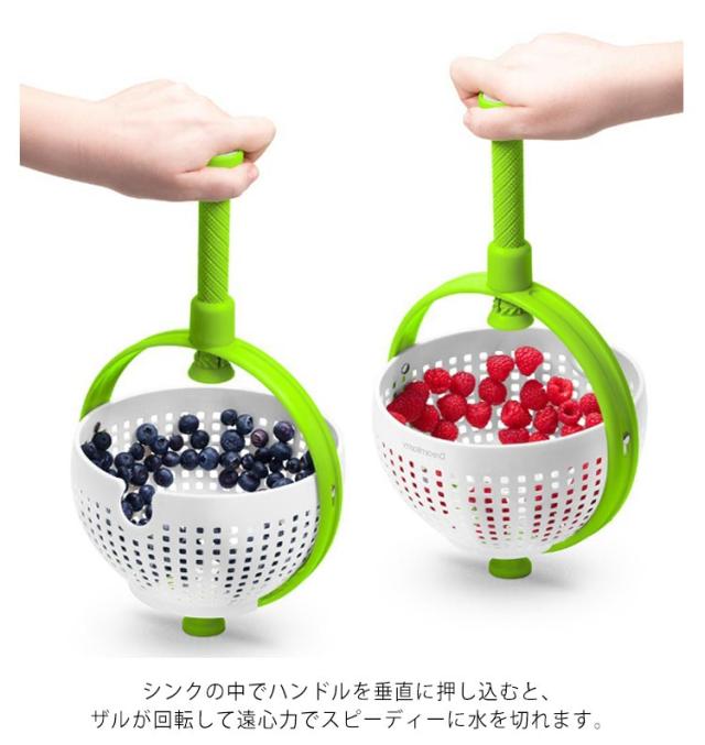 | サラダスピナーとザルが一つに♪ サラダスピナーの機能を兼ね備えたハンドル付きの水切りザル。 シンクの中でハンドルを垂直に押し込むと、ザルが回転して遠心力でスピーディーに水を切れます。 吸盤がシンクに吸着するので、安定感バツグン! | |