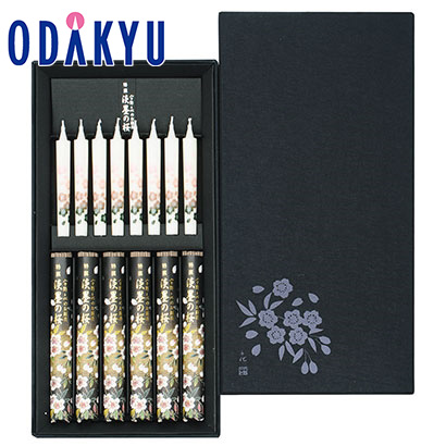 優艶な桜の香りと天然白檀を配合しています。贈答用として人気のお線香、特撰淡墨の桜に絵ローソクをセットにしました。絵ローソクは植物性原料配合で着色料を使用せず、自然な色合いを大切に仕上げました。