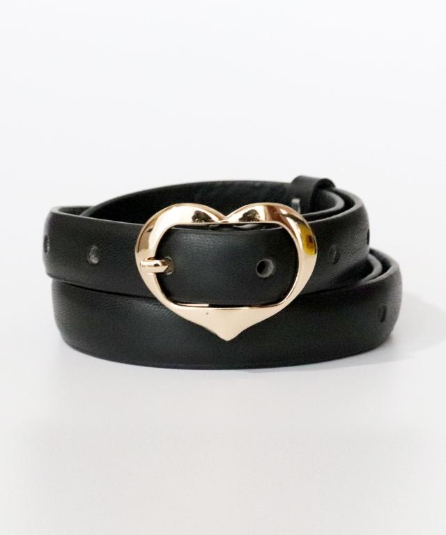 ハートやチェーンモチーフの個性的なバックルが全体のコーデを引き締めてくれる。