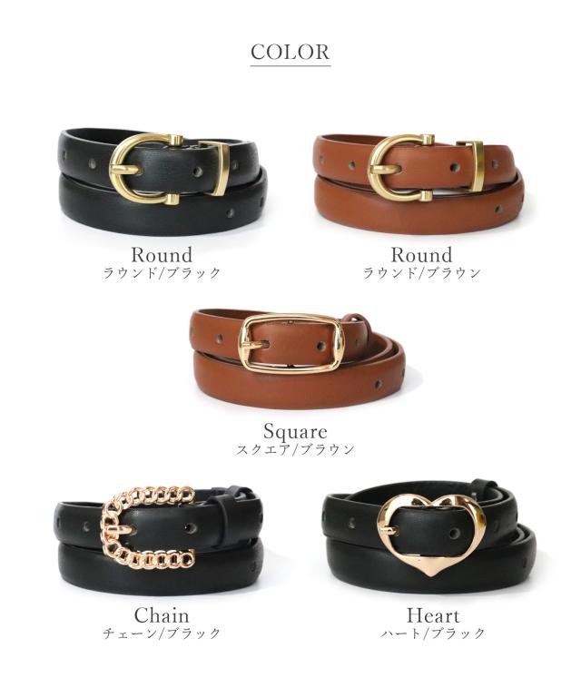 ベルト レディース PUレザー 細め 4タイプ展開 ユニーク バックル 細 通勤 通学 黒 大人 おしゃれ カジュアル シンプル 大人可愛い オフィス 大人女子 ブラック 合成皮革 ラウンド 円形 スクエア 長方形 チェーン ハート かわいい 可愛い