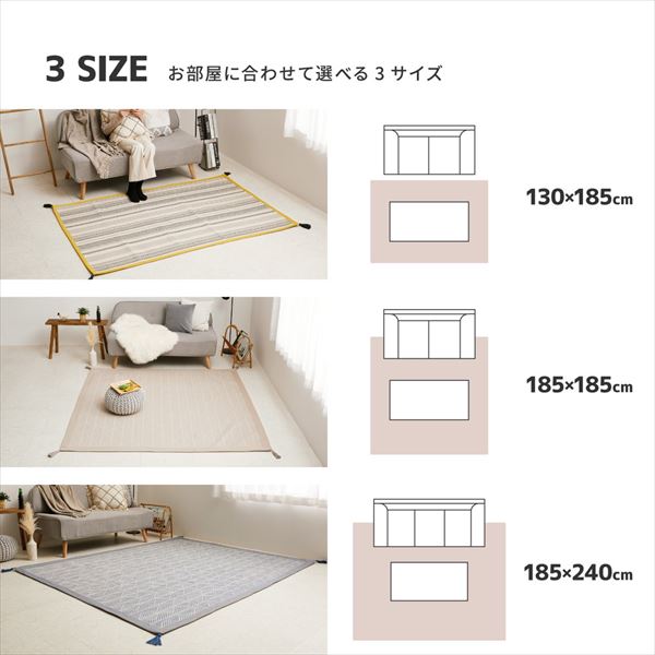 | 商品説明 | ●インド綿100%でサラッとウレタンフォームでフワッと ●ウレタン入りの程よいクッション ●日々のお手入れも簡単 ●裏面滑り止め付き ●ホットカーペット、床暖房対応 ●お部屋に合わせて3サイズをご用意 ●洗濯機で洗えます(ドラム式不可) ※ご家庭でのお洗濯の場合、洗濯機は余裕を持った大きさをお使い頂くか、コインランドリー等でのお洗濯をおすすめいたします。 ※こちらの商品はウォッシャブル仕様となっておりますが、3~5%の縮みが発生することがございます。綿素材の特性になりますのでご了承頂けます様お願い致します。 |