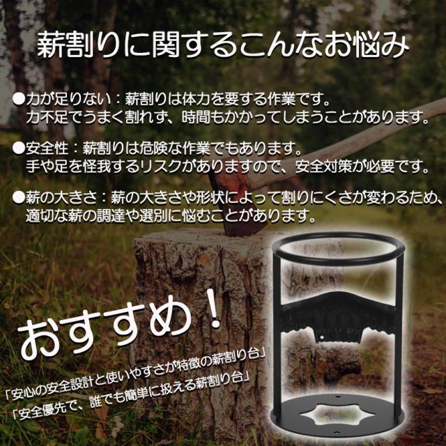 【運用上の安全性】薪割り刃の部分に手が入らない設計のため安全です。可動部品や鋭い刃はありません。薪割り台は基本的にメンテナンスフリーです。