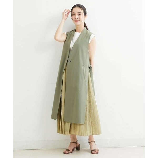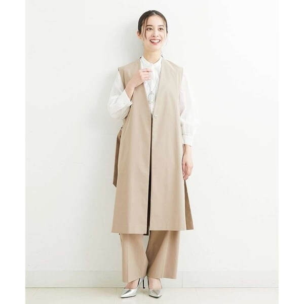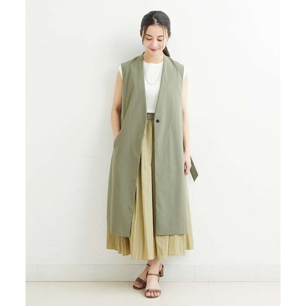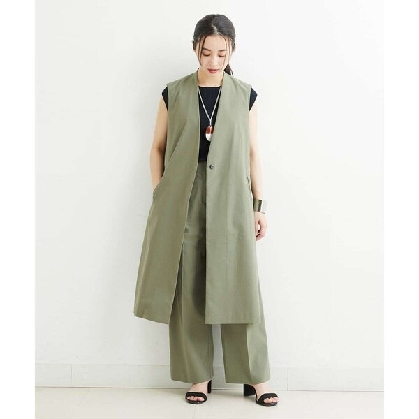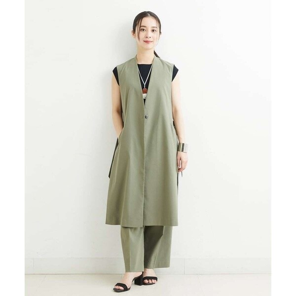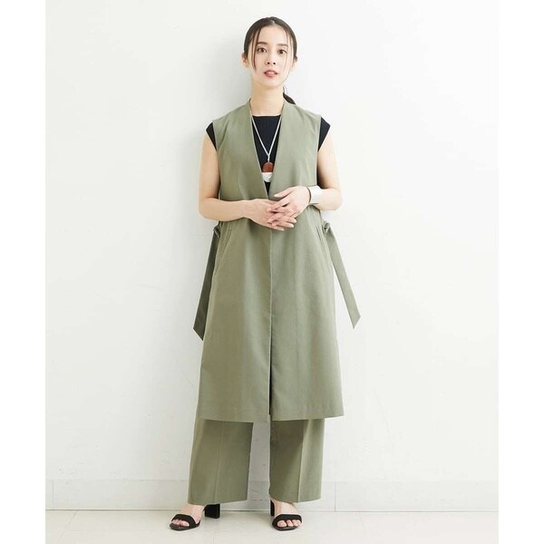 スッキリとしたシルエットでクールな印象を与えてくれるロングジレ。サイドを大きく開けて、長めのDカンベルトで留めるタイプのデザインでトレンド感が溢れる旬顔ジレ。同素材のパンツ[PHLHT01230]とのセットアップスタイルや柄パンツ・スカート・ワンピースなど、合わせるアイテムを選ばず、1点投入するだけでコーディネートがサマになります。インナーにはボリュームスリーブのカットソーやロゴTシャツで軽く合わせるのがおすすめです。暑い季節はTシャツだけでは寂しくなりがちなコーディネートに、ジレを羽織ることでトレンドコーデに早変わりです。