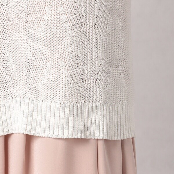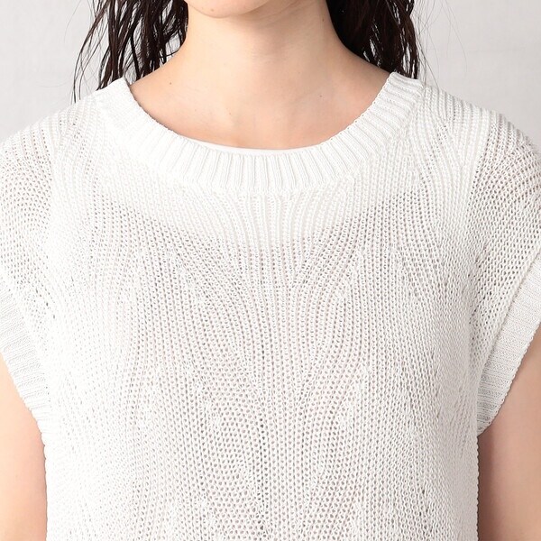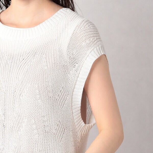 ニットは疑麻加工をしたビスコースとナイロンの混紡糸を使った変形のケーブル柄です。