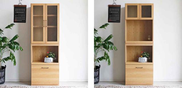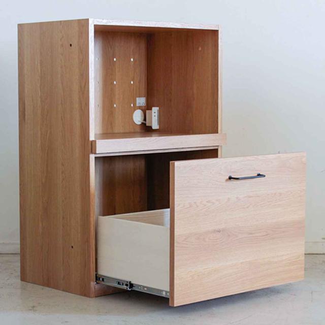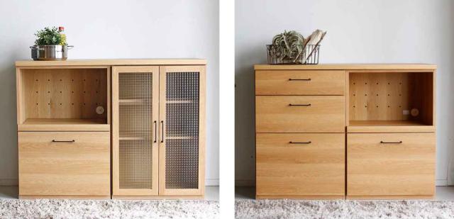 下部は引き出しになっていて、乾物などのストックを入れることができます。また有効高が37cmあるので書類なども入れる事ができ、キッチンだけでなくリビングに設置しても活躍できます。