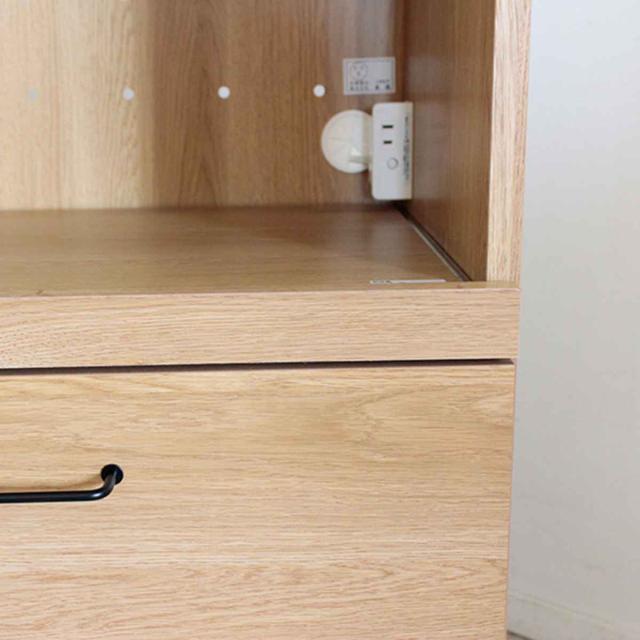 スライド収納内には1口コンセントがついていて、スライド収納を引き出して使用する時に家電のコードの長さを調節しやすいです。また、背面には通気口も開いているので炊飯器などの熱気がこもりにくいです。