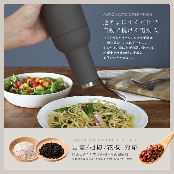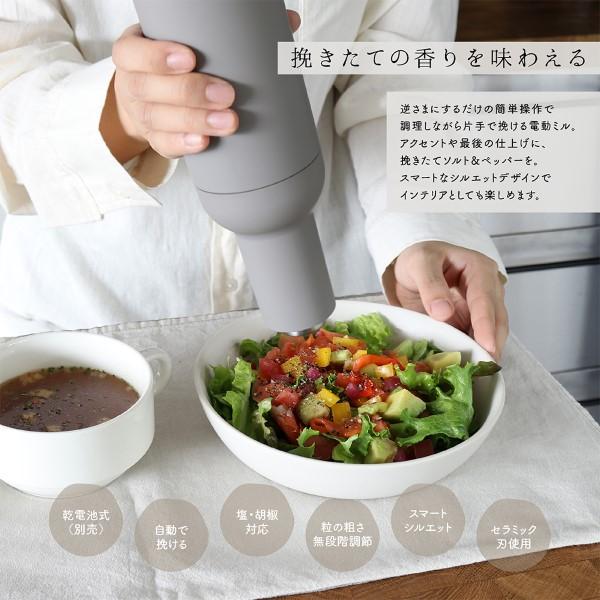 逆さまにするだけで自動で挽ける電動式 本体を逆さまにするだけの簡単操作で片手で挽ける電動ミル。 フタを外したりボタンを押す手間は一切必要なし、 料理中や食事の際に手軽にお使いいただけます。 岩塩・胡椒・花椒に対応しており、粒の粗さを無段階で調節可能。 アクセントや最後の仕上げに、挽きたてのソルト&ペッパーを。 空間になじみやすいカラーリングでインテリアとして 飾っておけるスマートなシルエット。 ■本体サイズ(約):直径7×高さ22.5cm ■重量:約335g ■電源:乾電池式 : 単4形アルカリ乾電池6本(別売) ※記載は商品仕様の一部です。仕様説明不足等の理由での返品はできません。特に適合等は必ずご確認ください。