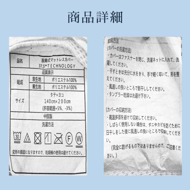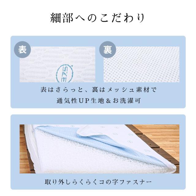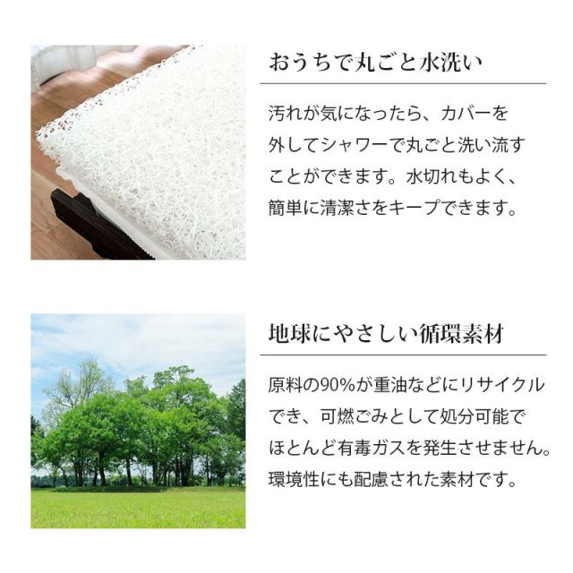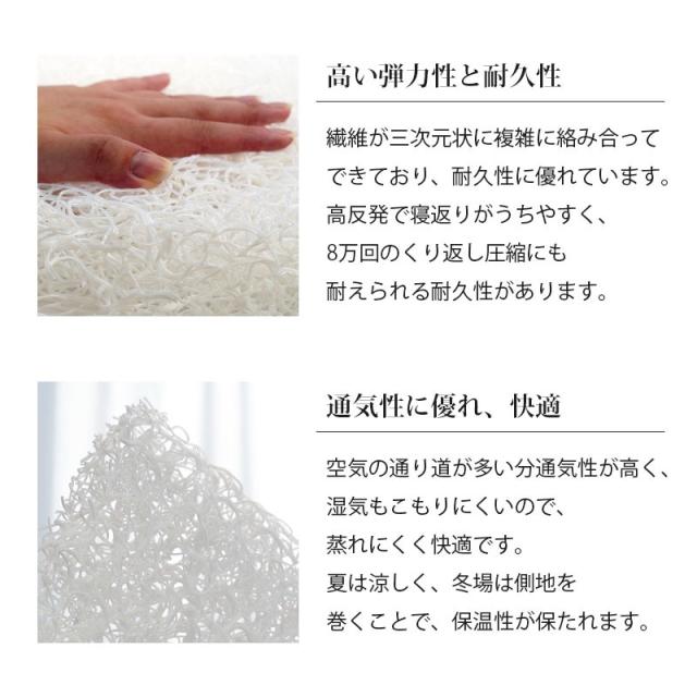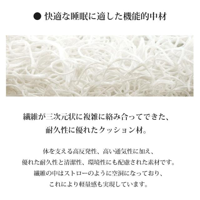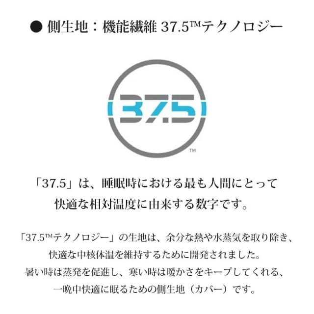 | ・37.5?TECHNOLOGY 37.5?TECHNOLOGYで作られた寝具は余分な熱や水蒸気を積極的に取り除き、最適な快適ゾーンを維持するために作られました。また37.5?TECHNOLOGY寝具の天然活性ミネラルは、温度を維持するために除湿し、よりよく眠れるように個人に合った温度を維持します。また自然に由来した活性粒子により、寒い時に体を温め、暑い時には体を冷ます調湿機能があります。 ・体圧分散性に優れた中材高反発で優れた体圧分散を実現するだけでなく、弾力性を高め正しい寝姿勢を保持します。汚れでもシャワーで丸洗いでき、清潔感も保てます。 ・中材の特長■クッション性が高く、体圧分散性に優れています。重たい腰やおしりの部分もしっかりと受け止め、自然な寝姿勢になるようサポートします。 ■高反発なので寝返りしやすい ■通気性が高く、寝汗などによる蒸れをすばやく放出して、不快な湿気を溜め込みにくい ■(一社)繊維評価技術協議会のSEKマーク(抗菌防臭加工、制菌加工)認証を取得済み。 ■汚れたときはシャワーなどで洗い流すことができ、水切れもよく、清潔をキープ ■耐久性・耐熱性に優れた原料を採用 ■1本1本の繊維が細いストローのように中空になっており、これにより、軽量化を実現 | |