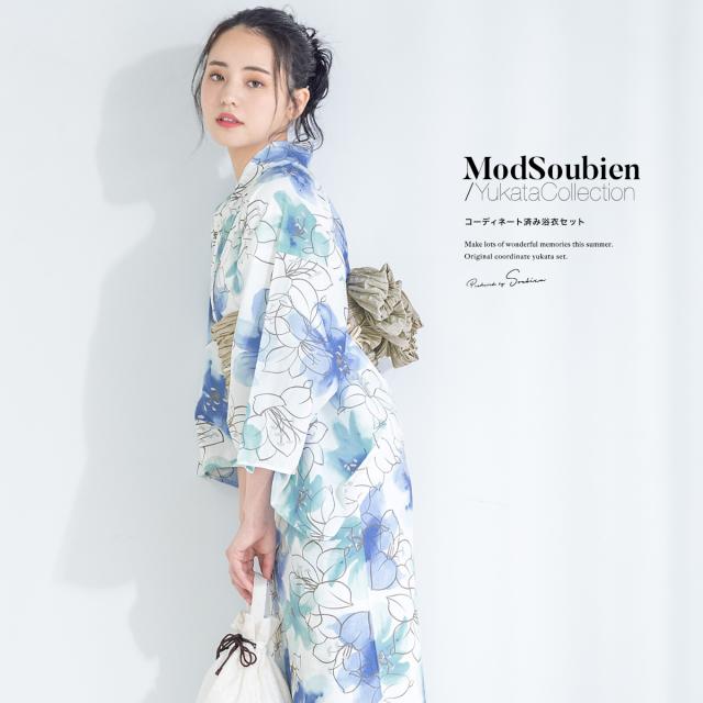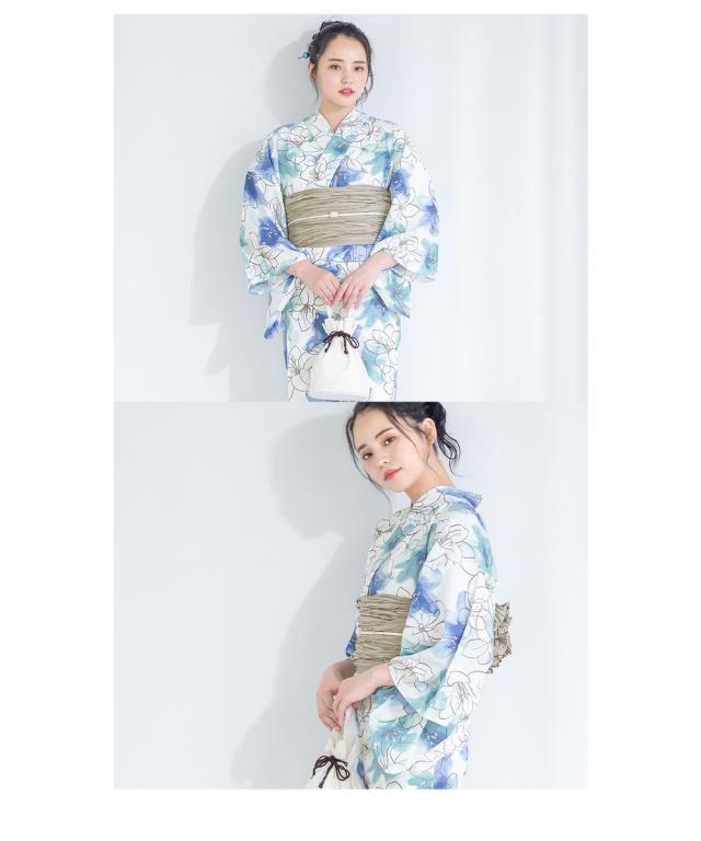 浴衣 セット レディース 浴衣セット 兵児帯 2023 大人 3点セット ホワイト 白 水色 青 百合 花 フラワー 亜麻色 S フリー 送料無料