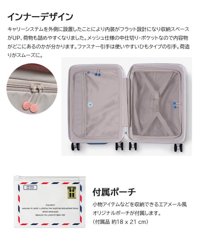機内持ち込み可能サイズ(国際線、国内線100席以上)で、出張や短期旅行に使いやすいスーツケースです。