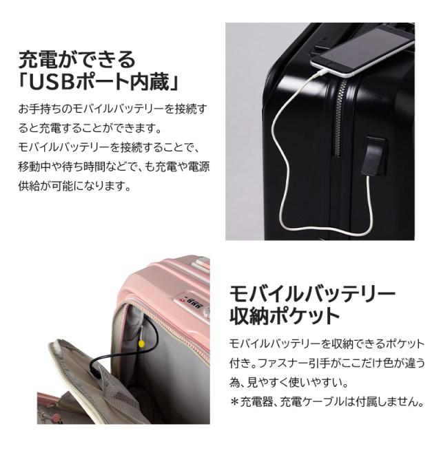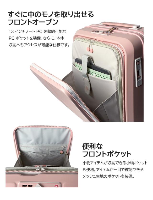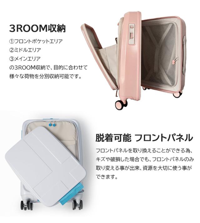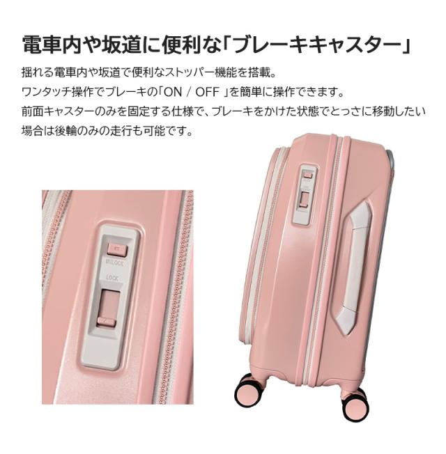 ワイドキャリーとフロントオープン、前輪ブレーキを備え、USBポートや3ROOM収納で移動中の使いやすさを高めた機内持ち込み対応スーツケース