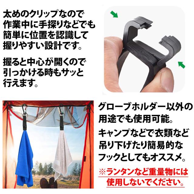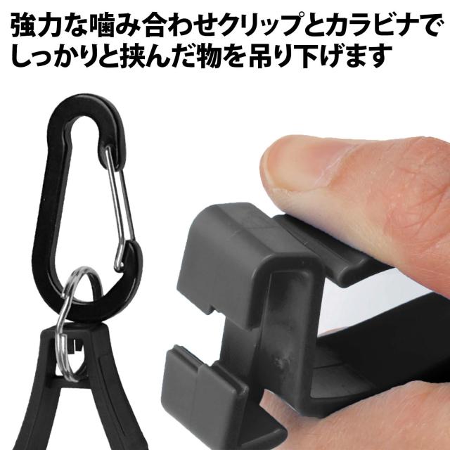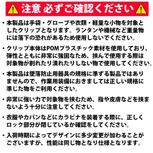 ・本製品は手袋・グローブや衣類・軽量な小物を対象としたクリップとなります。ランタンや機械など重量物には落下の恐れがあるため使用しないでください。