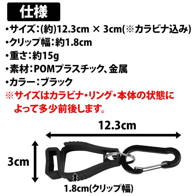 ・クリップ本体はPOMプラスチック素材を使用しており、弾性とともに非常に強固なため、挟んで使用する際は対象物が割れたり潰れたりしない物で使用してください。