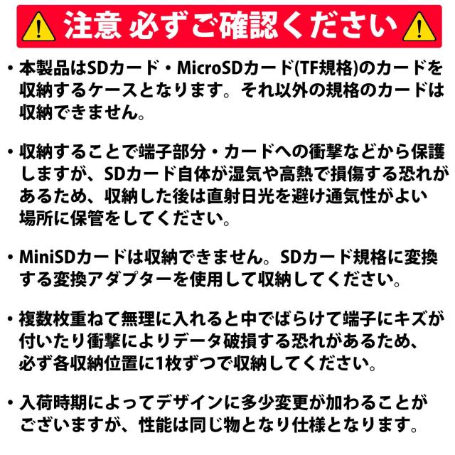 ・本製品はSDカード・MicroSDカード(TF規格)のカードを収納するケースとなります。それ以外の規格のカードは収納できません。