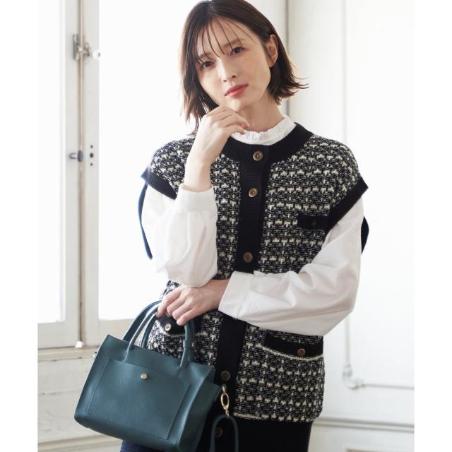 ツイードジャケットのようなエレガントさがありつつ、ニットでカジュアルに着られる、大人のデイリー使いにちょうど良いベスト。
