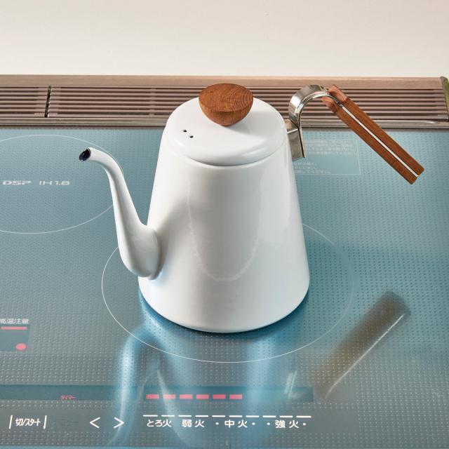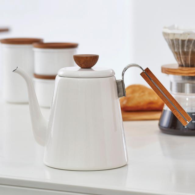 琺瑯と天然木の組み合わせがナチュラルな雰囲気のドリップケトル