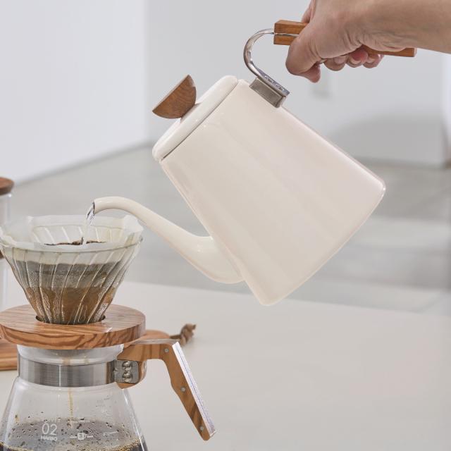 琺瑯と温かみのある天然木の組み合わせがナチュラルな雰囲気のドリップケトルです。