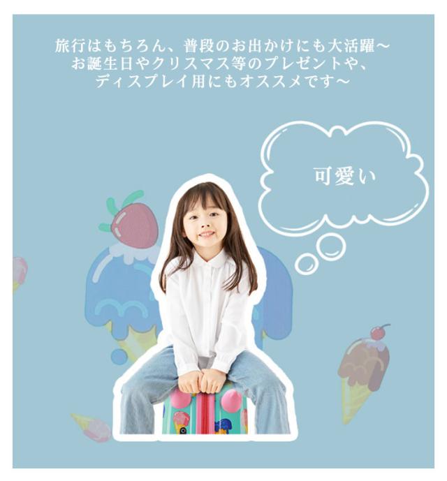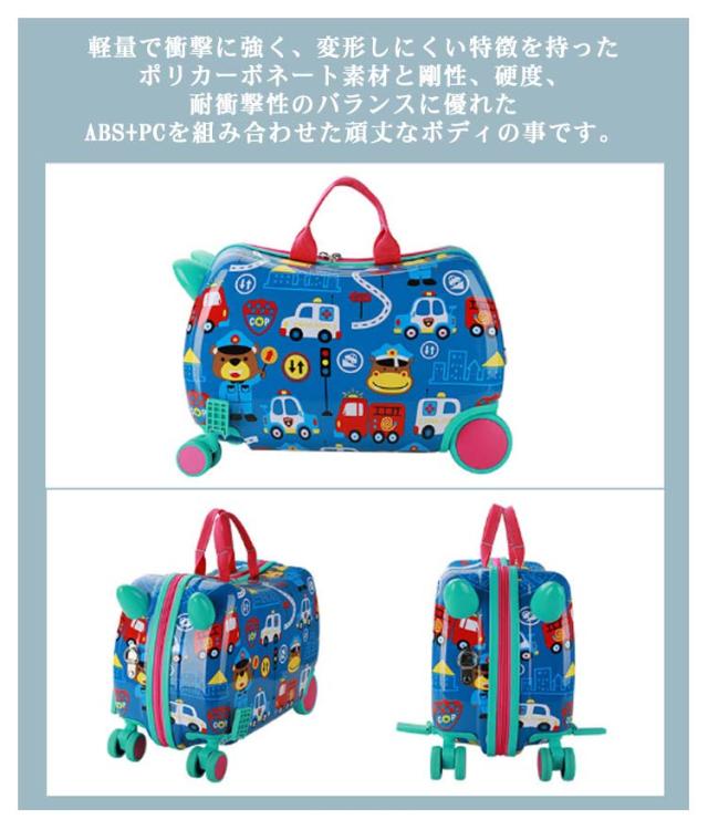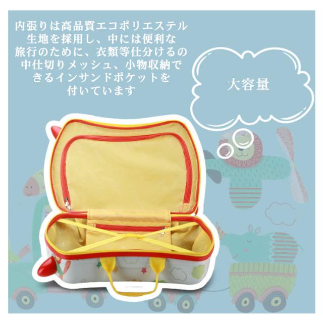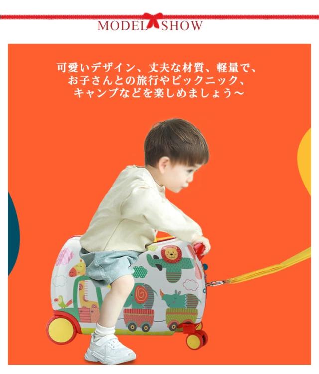 | 1台2役の乗って遊べる子ども用スーツケースです。【耐荷重50KG】 軽量で衝撃に強く、変形しにくい特徴を持ったポリカーボネート素材と剛性、硬度、耐衝撃性のバランスに優れたABS+PCを組み合わせた頑丈なボディの事です。 内張りは高品質エコポリエステル生地を採用し、中には便利な旅行のために、衣類等仕分けるの中仕切りメッシュ、小物収納できるインサンドポケットを付いています 耐荷重は50KGで、またキャスター付きなのでスーツケースの背中に乗って遊べます! 飛行機の手荷物入れに収まるサイズです 可愛いデザイン、丈夫な材質、軽量で、お子さんとの旅行やピックニック、キャンプなどを楽しめましょう〜 旅行はもちろん、普段のお出かけにも大活躍〜お誕生日やクリスマス等のプレゼントや、ディスプレイ用にもオススメです〜 | |