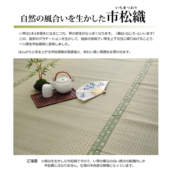 ■長さ110〜115cm程の国産(イ草の産地熊本県八代産)い草を使用しています。そのうち約88cmを使用しています。通常ヘリ際は強く白みを帯びます。(日焼けではありません、い草の根元と先端部分の色です。)このイ草の根元と先端の色が違う特徴を活かし、市松柄を表現しております。(なので、根元の白い部分の範囲内しか市松柄になりません。真中部分は無地になります。)