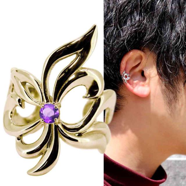 イヤーカフ メンズ ゴールド 18金 18k イヤカフ かっこいい 百合の紋章 片耳用 アメジスト レディース 2月誕生石