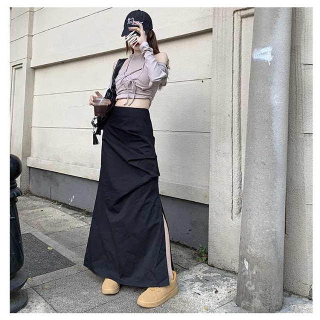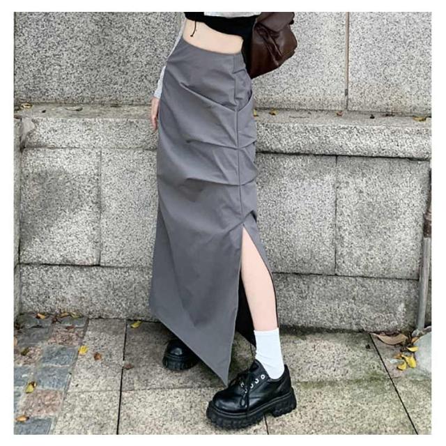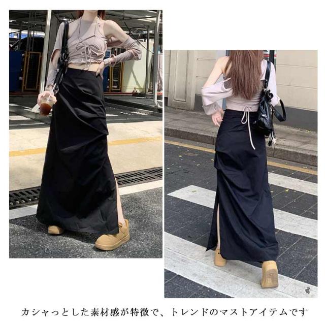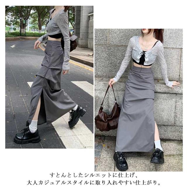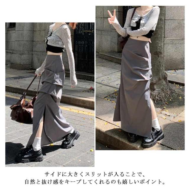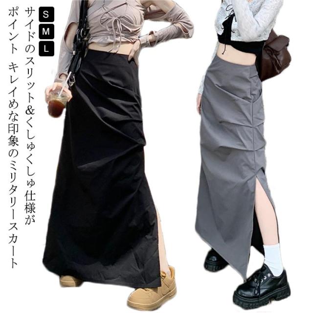 ミリタリースカート サイドスリット カーゴスカート レディース スカート ロングスカート マキシ丈 タイト スカート ハイウエスト くしゅくしゅ 春 夏 秋 ミリタリー ストリート カジュアル ブラック 黒 グレー 【送料無料】