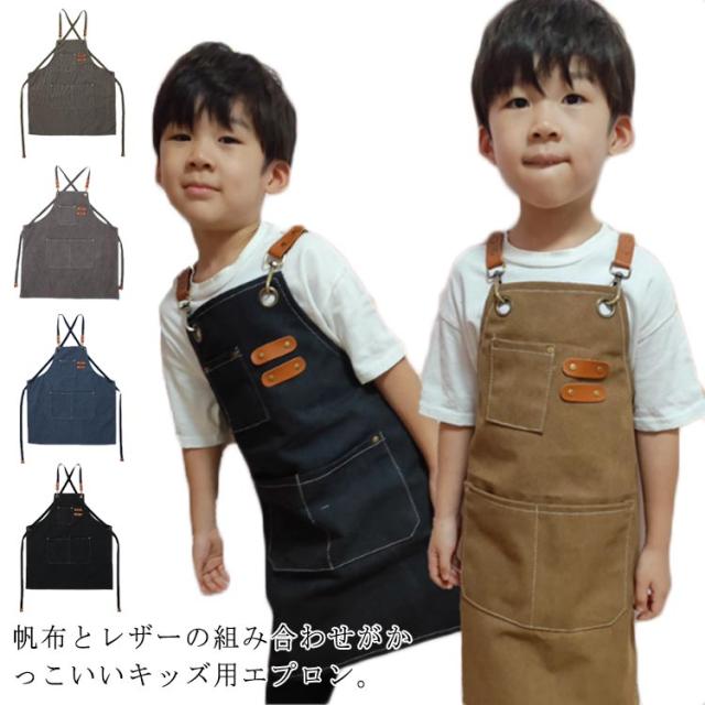 キッズ エプロン キャンバス 帆布 エプロン 無地 シンプル おしゃれ かっこいい 子供 エプロン ジュニア 女の子 男の子 こども用 子ども用 前掛け 子供用エプロン 幼稚園 保育園 小学校 中学校 給食 入学準備 入園準備 撥水 レザー ポケット付き 送料無料