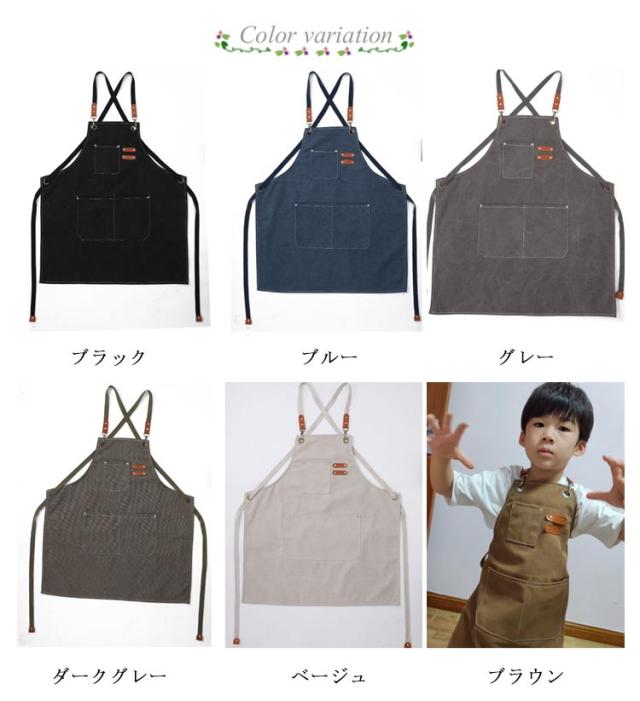 | 帆布とレザーの組み合わせがかっこいいキッズ用エプロン。 しっかりした厚手のキャンバス生地を使用し、丈夫で長持ち。 フロントに便利なポケットが付いているので、使いやすさもバツグン。 クロス仕様の肩紐で長時間の着用も疲れにくい構造です。 着脱カンタン!サッとかぶって腰紐を結んで、小さな子様でも簡単に着脱できます。 | |