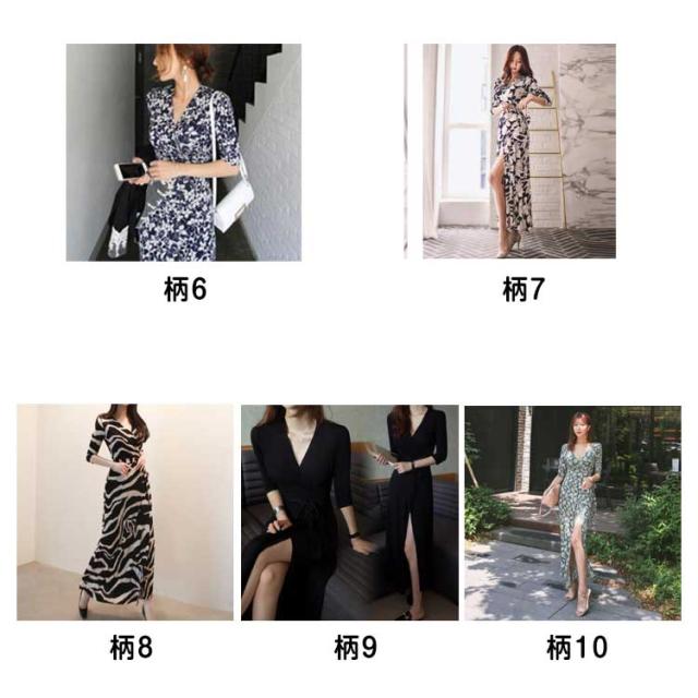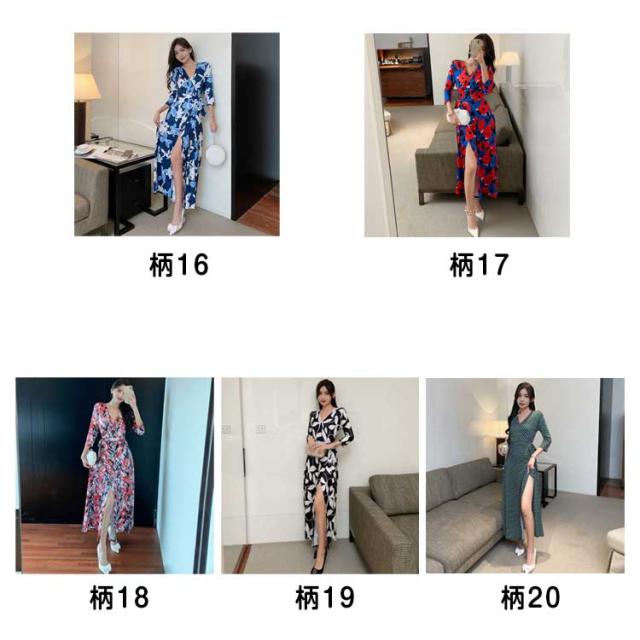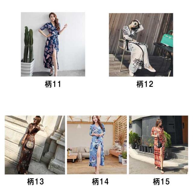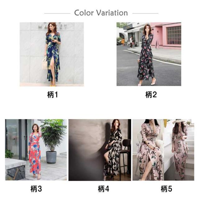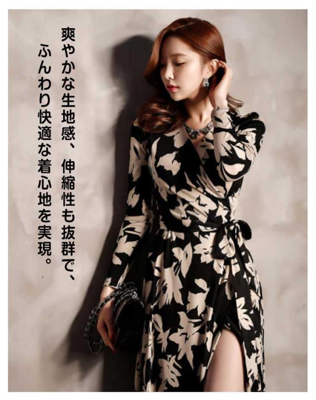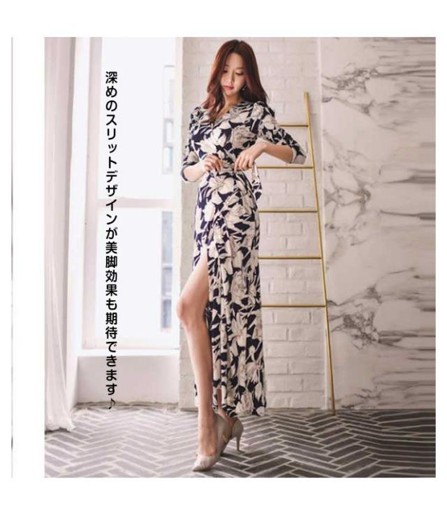 リゾートワンピース カシュクール ワンピース ラップワンピース ロング丈 七分袖 Vネック 美脚 ラップドレス ストレッチ きれいめ 大人 女性 花柄 エスニック Aライン スリット 旅行 ハワイ ジャージー エレガント 二次会 キャバ 送料無料 ギフト プレゼント