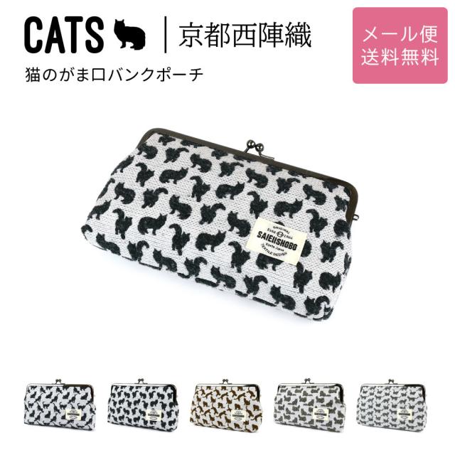 猫のがま口バンクポーチ CATS 西陣織 日本製 猫柄 生地 撥水加工 ジャガード レディース メール便送料無料 通帳入れ マルチポーチ 猫グッズ 雑貨 猫好き ホワイト/ブラウン/チャコール/グレー 25047030